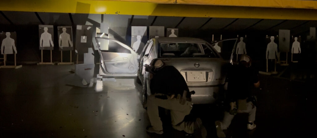 Keep low, it is common for students to cheat a little with regard to how low they get on the cars. If your head is visible above the vehicle or through a window, when you are shooting down the side of the car, that is another target indicator for the bad guy to engage. Stay low.